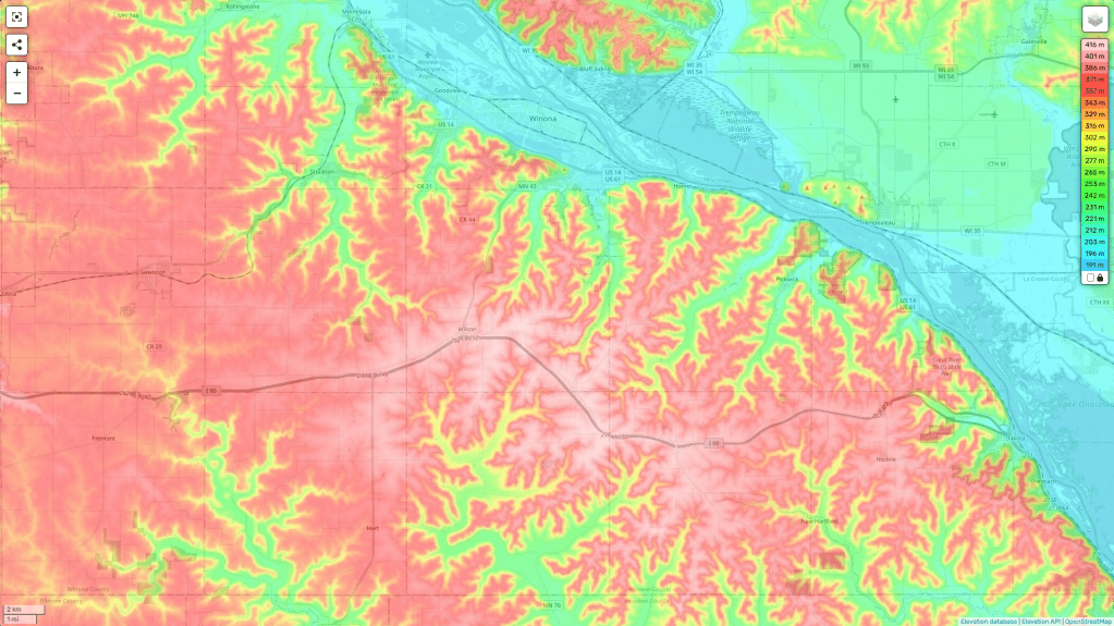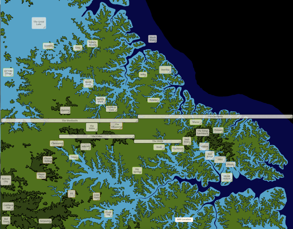 My first images of the world that would become Wilderlands came from looking at sites topographic-map.com, zooming in to an arbitrary level, and saying, “Okay. Everything in red is the new existing landmass. Everything else is water.”